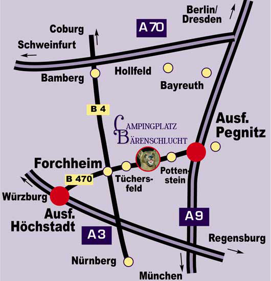 Der Campingplatz Bärenschlucht, liegt direkt an der B 470 zwischen Forchheim und Pegnitz