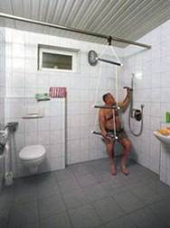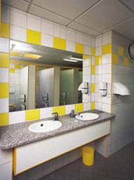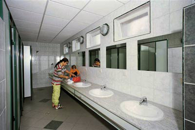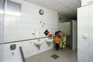 Moderne sanitäre Einrichtungen, separater Sanitärraum für Behinderte, Einzelwasch- und Duschkabinen, Kinderdusch-